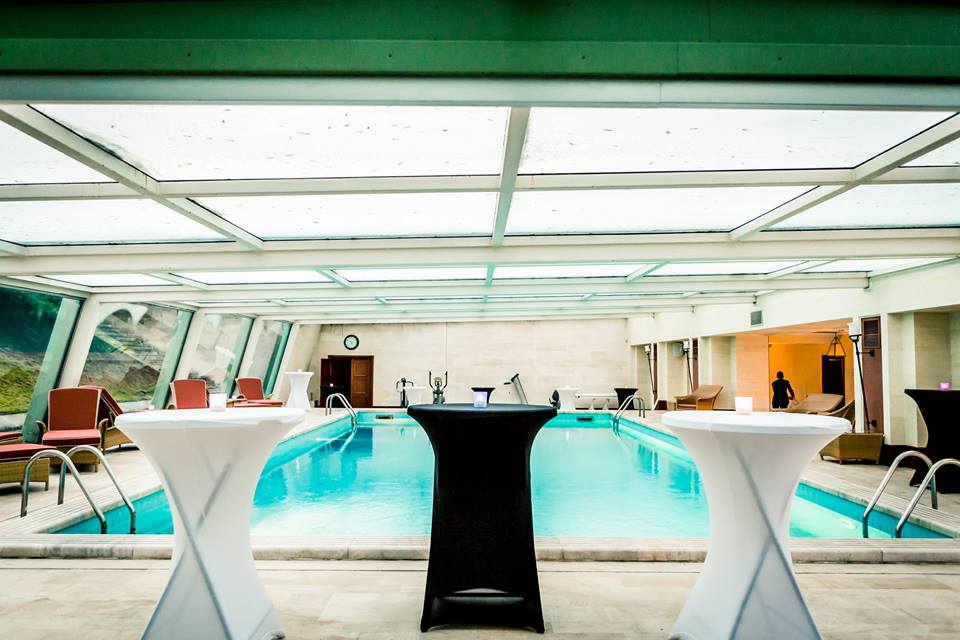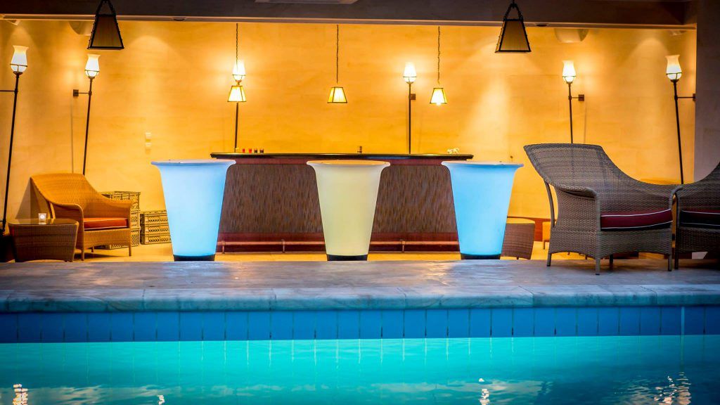 Prestation réalisée pour Lidl au Château des Forgets : location de mange-debout avec housses lycra et location de mange-debout lumineux :